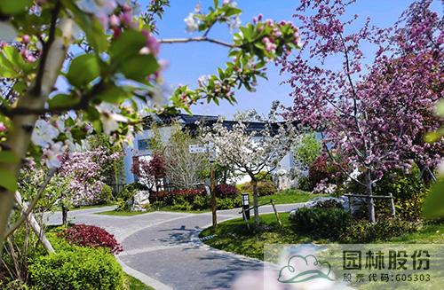 穿过迎宾入口,沿着曲折的园路前行,道路转折处,一紫一白盛放的两棵海棠,满树繁花,明艳动人,瞬间夺人眼球。“这是一个流动空间,穿过这两棵海棠,往左转,是海棠书院,院子前形成一个停留空间,可供游人在此驻足赏景。” 边华锋指着眼前的景观介绍道,“往右转,一棵枝繁叶茂的鸡爪槭位于草坪中间,与周边几棵小规格的鸡爪槭相互呼应,形成一个过渡空间,但这个空间和前面的空间大小、表现手法又各不相同。”