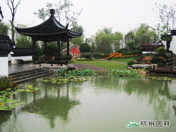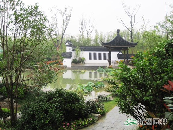 第二届中国绿化博览会之杭州园,又名“缘园”。以西湖美丽的传说《白蛇传》为设计脉络,将故事提炼成断桥相逢、同心定缘、平湖秋月、雷峰夕照四个精华部分,融入到工程绿化作品中,运用多杆丛生植物和木本花境为造景元素,平台、小桥、埠头、沙滩、景石,勾勒水乡风韵;粉墙、黛瓦、圆门、方亭、水榭,追忆江南情怀,由此达到了景中有情、情中有景,用园林绿化的丹青妙笔描绘出一幅情景交融的江南风情画卷。漫步缘园,仿佛回到千年前的西湖:风景如画、才子佳人、江南烟雨、风光旖旎,断桥之上,许仙与白娘子洋溢缠绵悱恻的浪漫爱情传奇……