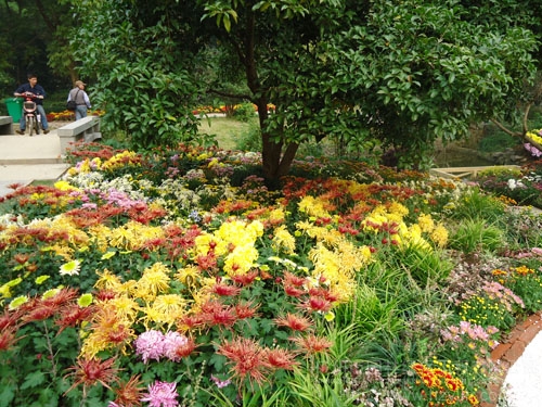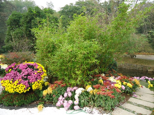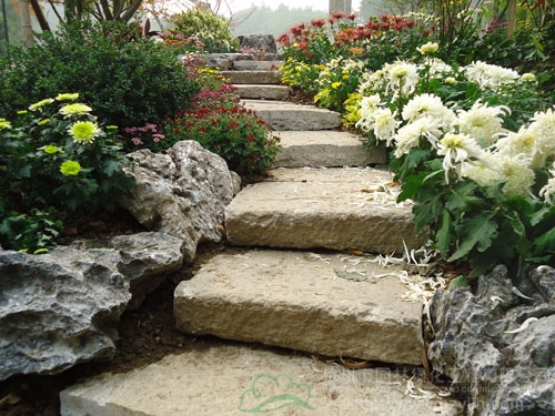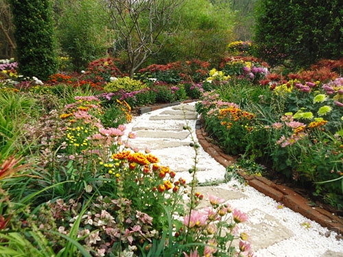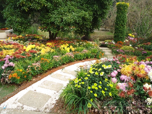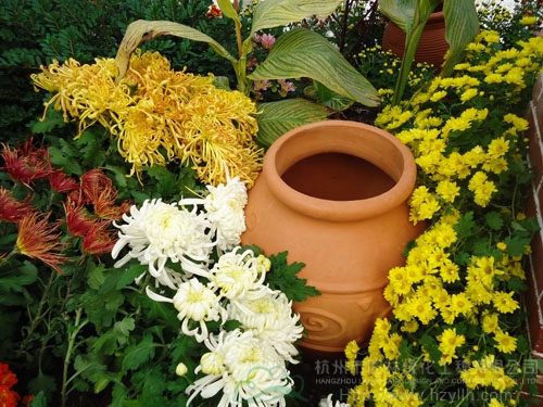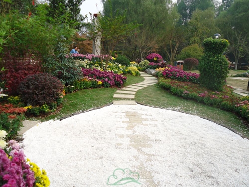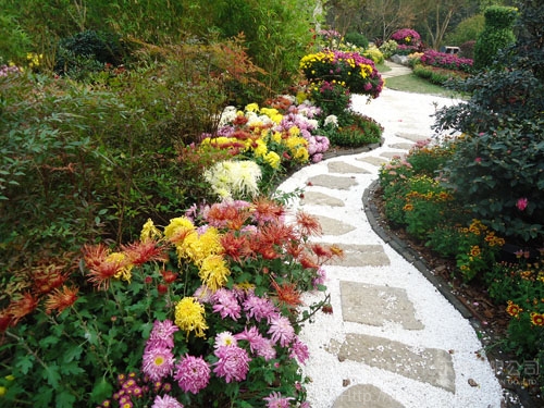 蜿蜒的园路、白色的石子、红色的陶罐、盛开的菊花