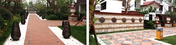 据杨经理介绍,紫金东郡小区里的铺装材料主要以橙红色的烧结砖和仿古砖为主,烧结砖具有承重量大和隔声性强的特点,是小区园路铺装的优良选择,此外,红色又与建筑的整体色调相搭配,有种浑然一体的效果感;而仿古砖除了具有防水、防滑、耐磨等特性外,还具有独特的古典韵味,更能营造出岁月的沧桑和厚重感。在铺装方式上,有的是道路中间用橙红色的烧结砖,两边铺设白色的石子,营造一种居家庭院的温馨感;有的是正方形的仿古砖与黑色的石子,一红一黑,相映成趣;还有的用白色的仿古砖作道路两侧的点缀,风格自成一体。纯美的色彩、流畅的线条、些微的暖调,不同的道路上别具特色的图案,使人走上去踏实、安稳而又感古朴、雅致,成为不断蜿蜒的脚下风景。