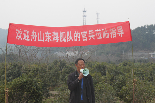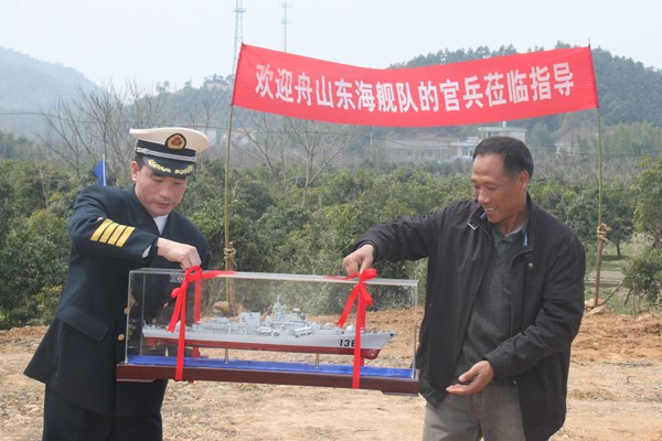 3月31日上午12点,舟山东海舰队某支队官兵们的车辆到达泉口苗木基地,现场举行了热烈的欢迎仪式。仪式由杭州市园林绿化工程有限公司总经理张炎良主持,杭州市林水局副局长杨文钟代表杭州市政府对官兵们的到来表示了热烈的欢迎,并发表了热情洋溢的致辞;舟山东海舰队某支队吕政委代表官兵们致答谢辞,并赠送给杨副局长一个海军军舰模型,表达他们对杭州市政府送树行为的感谢。