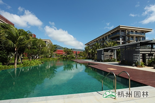 项目位于海南省三亚市亚龙湾椰风路南部,整体景观显得张弛有度,开阔大气的广场铺装、宛若绿色地毯般的草坪、色彩丰富长势茂盛的植物、蓝宝石般的碧蓝泳池……规整中不失自然,简洁中深藏精致,尽显现代主义风情的园林美景。
