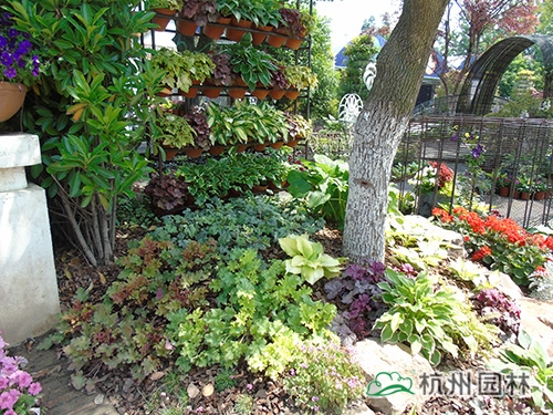 多彩的矾根与玉簪搭配,营造出色彩明快的林下地被景观