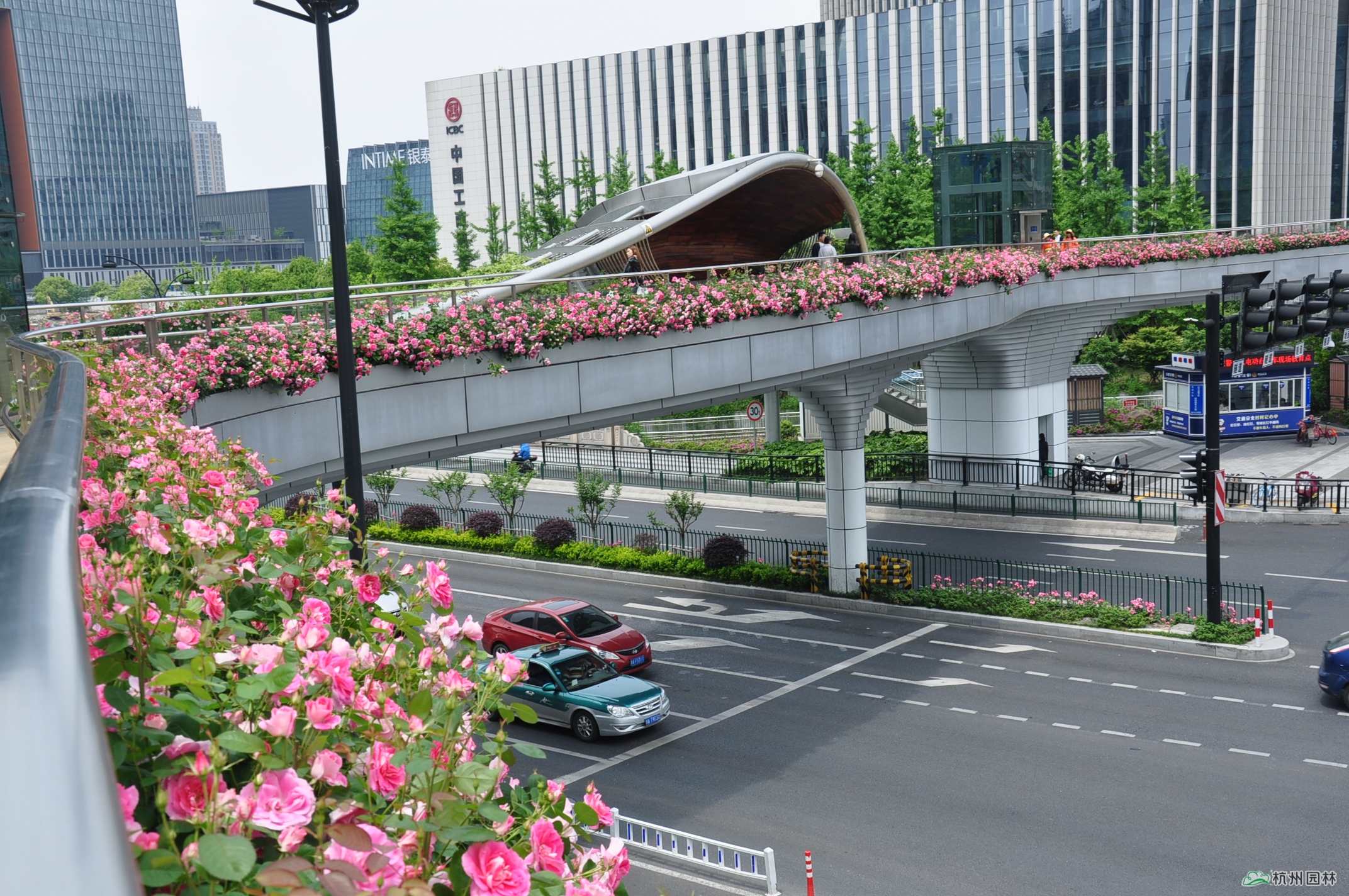 位于新塘路和庆春路交叉口的庆新天桥是新塘路综合整治工程的标志性建筑之一,也是杭州首座仿生态学原理的异形人行天桥。桥面独特的景观造型宛如一条风景秀美的彩色飘带,大量月季沿桥面外侧护栏种植,月季花盛开时节,桥面仿佛戴上了一条色彩绚丽的花环,美不胜收,充分体现了杭州包容、大气、开放的时代风貌、都市气质和国际视野。