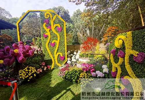 由杭园股份设计及施工的展品《江海相望 菊影弄潮》,以传统园林中的月门为主景,结合浪、船、影等构图元素,运用花带、花球、绿雕等形式,以菊的情致携西湖的精致,动静结合,营造出潮起江海、劈浪前行,守望相助、璀璨芳华的生动意境。此景象征着新时代长三角一体化“引航远帆”的涌动和发展;讲述着中华儿女携手抗疫、共克时艰的动人故事。