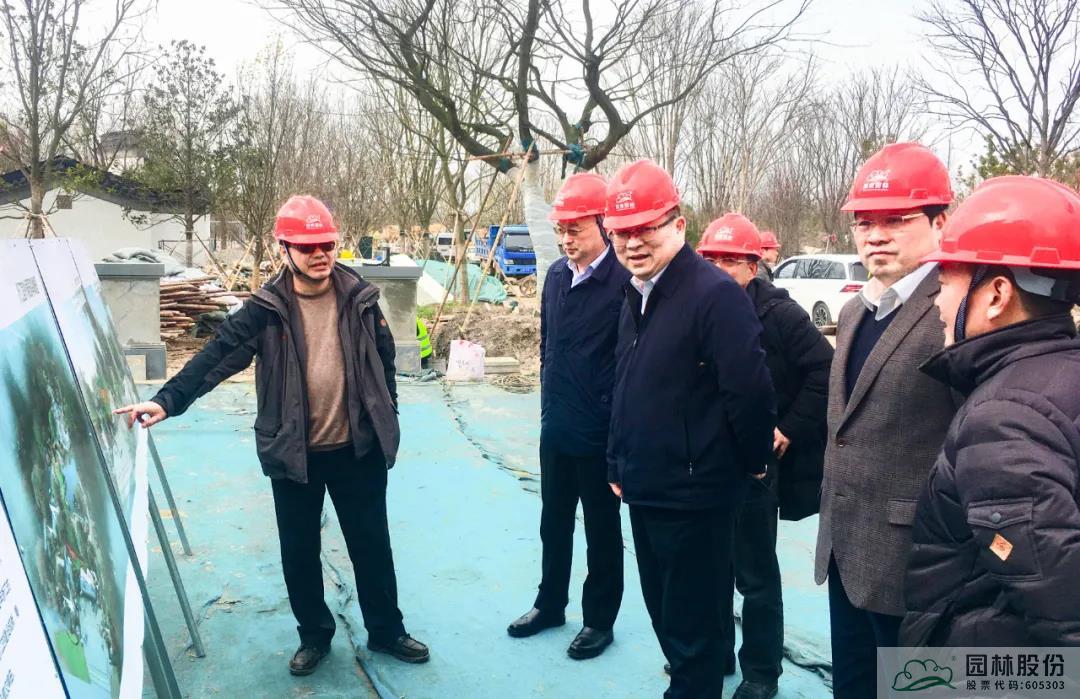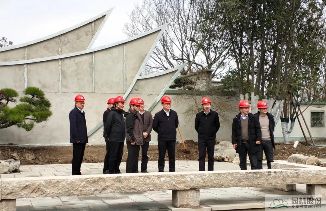 ▲胡侠(中)一行实地察看浙江室外展园施工进展情况