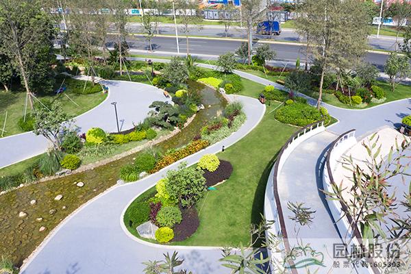 融入海绵城市理念打造的旱溪景观,用鹅卵石铺装,点缀景石,岸边种植造型水蜡、杨梅、芦苇、蒲草、三角梅、黄金叶、黄金榕、朱蕉、扶桑花、变叶木、红千层等当地乡土植物,打造生态环保的地域特色景观风貌。