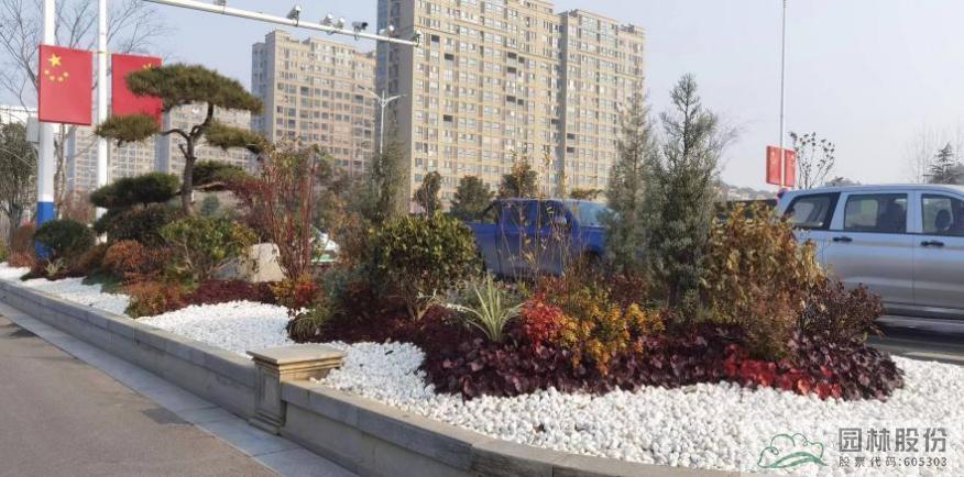 江山大道与黄山路、黄浦江路与项王路路口的植物配置,采用群落结构、组团配置和盆景化的自然式造园手法,在空间、色彩、节奏方面独具匠心,打造了高低错落、疏密有致的和谐景观。考虑到行车安全性与视线诱导因素,中央绿化隔离带以黑松桩的种植片段和花镜+球类的自然群落片段进行循环,打造规则中有自然的效果。机非绿化隔离带以黑松桩+花镜种植,打造艳丽的春景效果。