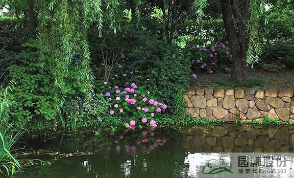池水静谧流淌,绣球微探,