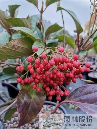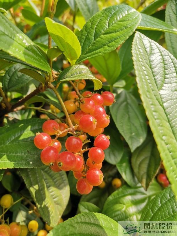 忍冬科荚蒾属,落叶灌木,株型紧凑聚拢,直立性强。叶暗绿色,聚伞花序白色,春季开花。核果球状卵形,果实颜色由绿色变成黄色,后逐渐转成红色,观果期长,果量和果实直径均较大。该种是荚蒾属中观果时间最长的物种。生长速度快,较耐修剪,耐寒耐干旱,适合工程应用或庭院观赏。