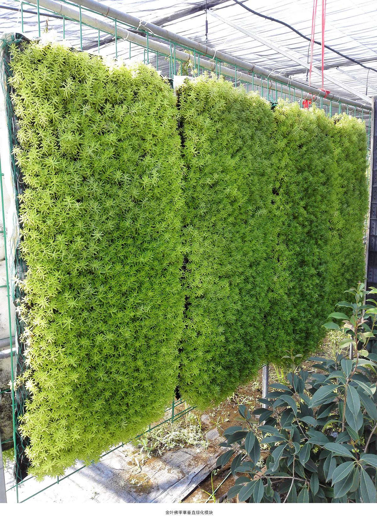 利用土工布、岩棉剪裁成一定规格与金叶佛甲草相结合,并运用工程技术,制作出四季便携式、轻型、降温的金叶佛甲草垂直模块。达到立竿见影的景观效果且生产周期短的目的,有利于大规模推广运用。